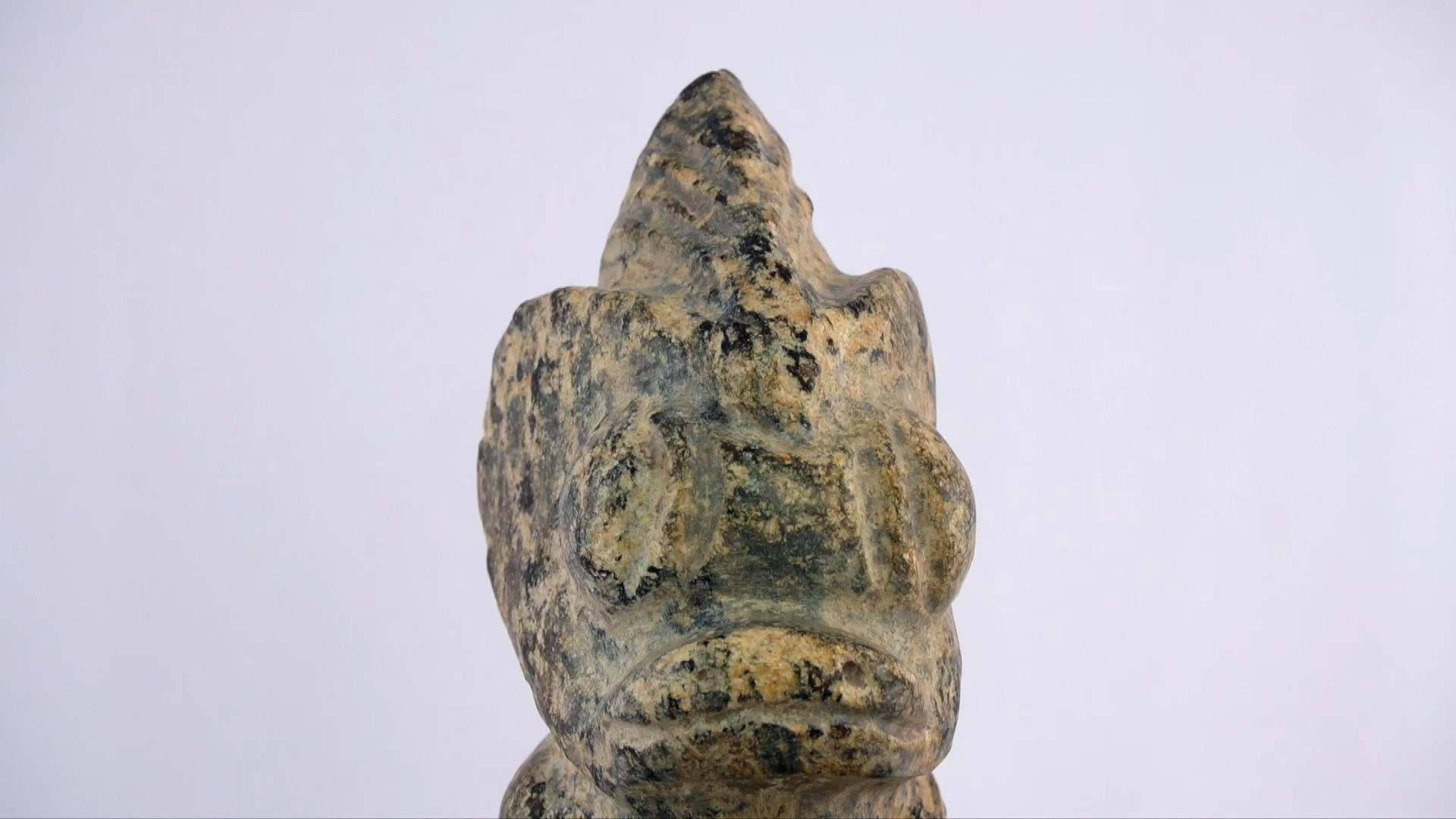 這個骨董石像呈現出非常奇特的形狀,上半部是一個外星生物的頭部,下半部是一個傳統的木魚身體。外星生物的頭部有一對大眼睛和兩個尖尖的耳朵,鼻子和嘴巴也非常獨特。而下半部的木魚身體則是相對傳統,由木材製成,表面平滑且光滑。
