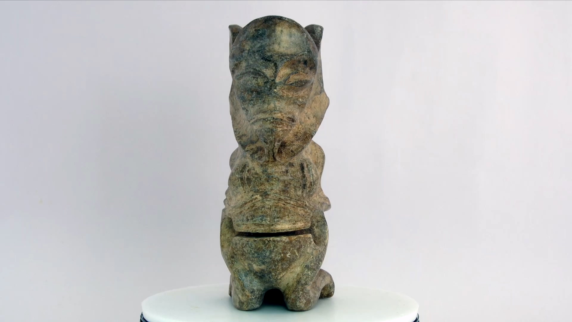 這個骨董是一個面具臉石像,被認為是來自南美洲的古代文明的一部分。這個石像的外觀非常生動逼真,透過石材的精湛雕刻和繪畫技巧,呈現出獨特的人臉特徵和高度細膩的細節。其面部被描繪成一個極具表情的男性臉龐,並配有各種裝飾品,如金色珠子、羽毛和貝殼等。