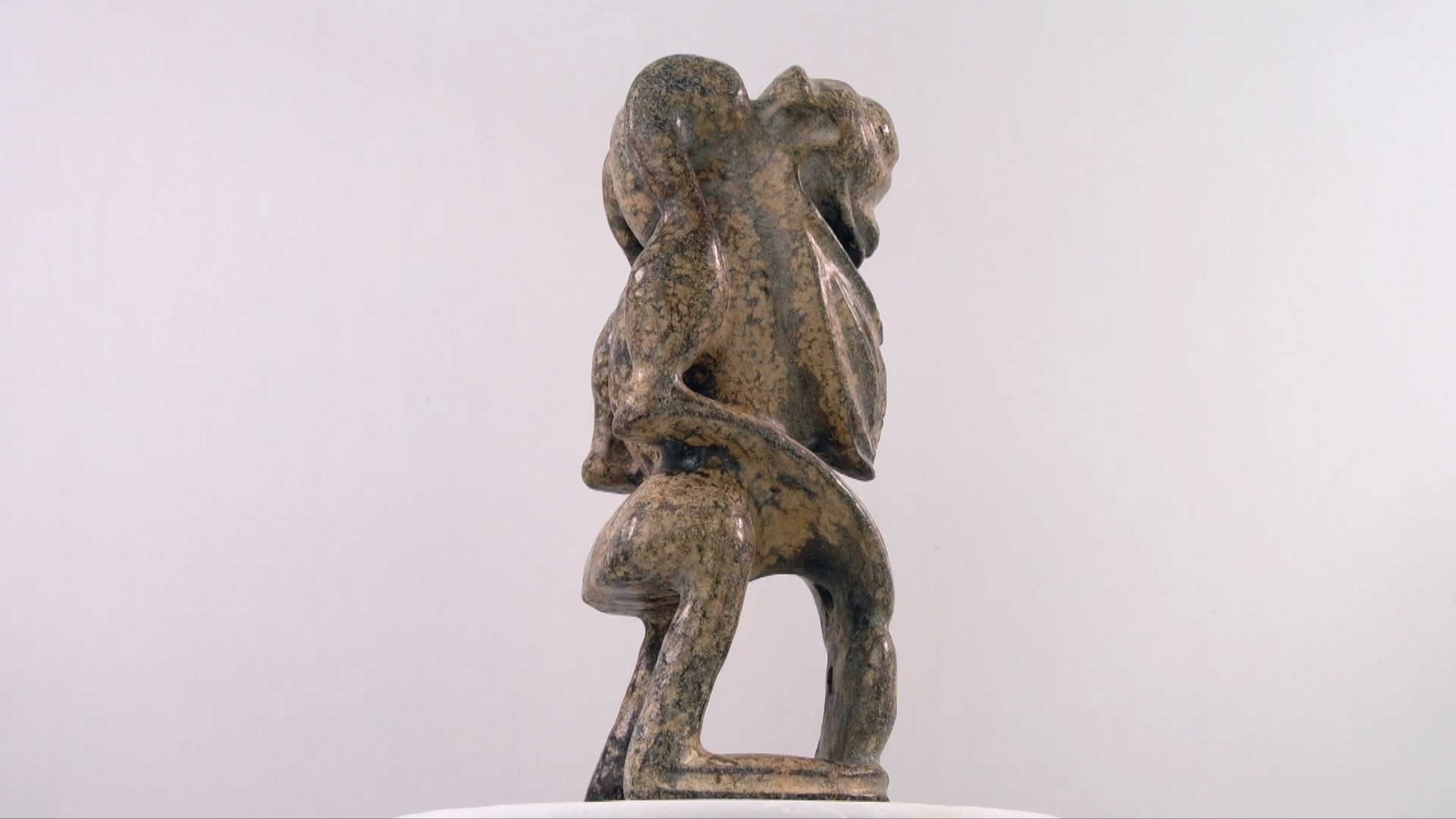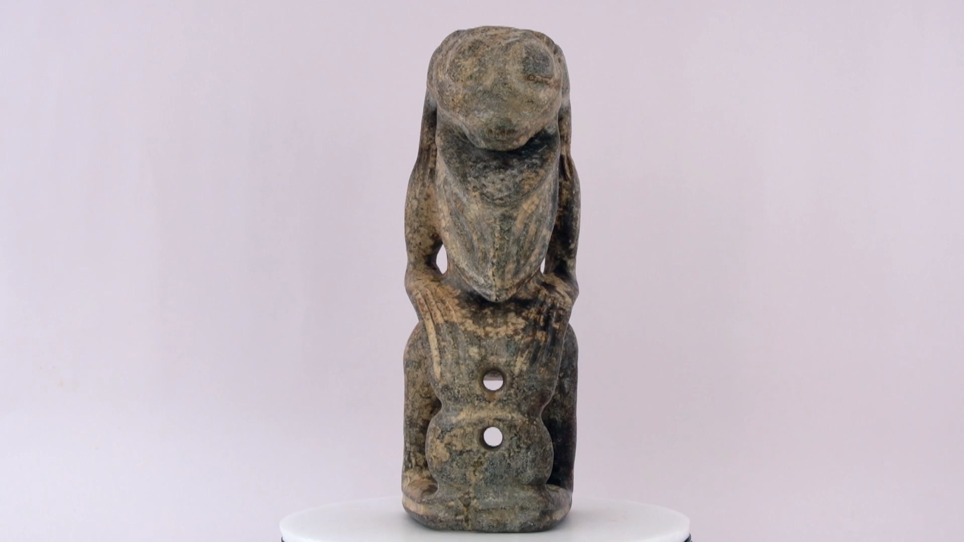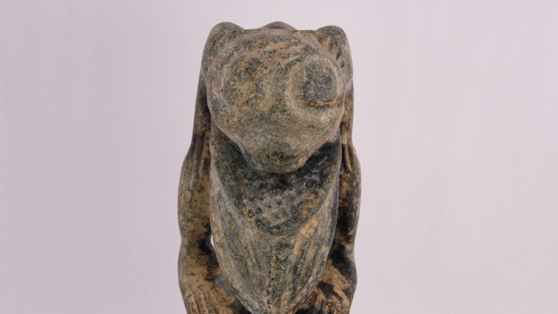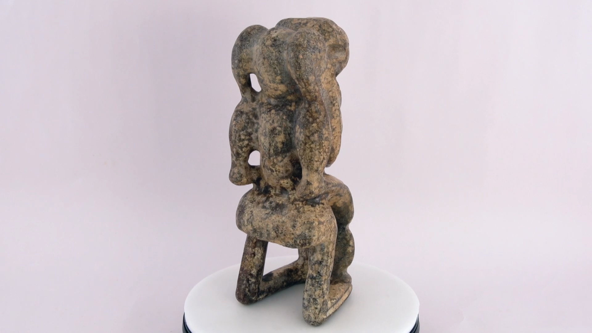 這件骨董是一尊石雕蝙蝠臉像,具有濃厚的中國古代文化特色。它是用天然石材製成的,整體呈現出精美的紋路和繁複的細節。